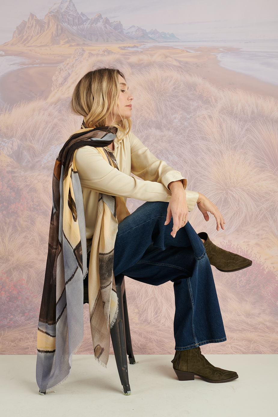 Storiatipicのストールは、巻くだけでコーディネートに彩りを与えます。